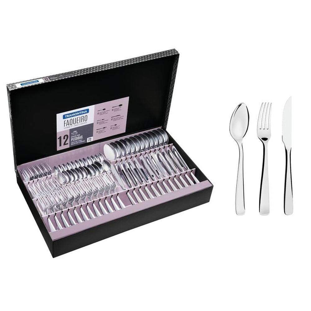 Sirva seus amigos e familiares em grande estilo com o Faqueiro Aço Inox 72 Peças Pacific da Tramontina. Produzido com material de excelente qualidade, é a opção mais do que perfeita para completar a decoração da sua mesa. Possuindo garfos polidos em sua parte interna, com um formato apropriado para a boca e bordas arredondadas para proporcionar maior conforto durante o uso. Com faca totalmente temperadas para garantir a durabilidade no fio de corte e maior resistência à corrosão, e por suas características de temperabilidade, não riscam as porcelanas.