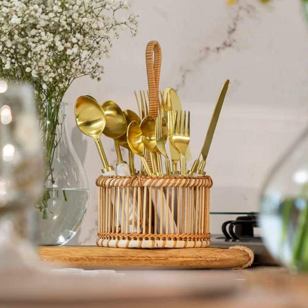 PORTA TALHERES REDONDO EM BAMBU E RATTAN COM ALÇA PORTA TALHERES REDONDO EM BAMBU E RATTAN COM ALÇA 0 avaliações | Dê a sua avaliação! Referência: 27605 Modelo/Marca: 309151 R$ 149,90 ou até 2x sem juros de R$ 74,95 Comprar Esse produto encontra-se indisponível. Deixe seu contato que avisaremos quando chegar. Seu nome: Seu e-mail: Desejo receber e-mails com lançamentos e promoções. Avise-me quando disponível R$ 149,90 à vista Boleto Bancário R$ 149,90 à vista Parcelas 1x de R$ 149,90 sem juros 2x de R$ 74,95 sem juros Indicar este produto Deixar comentário Adicionar à minha lista Chá Bar Chá de Casa Nova Chá de Cozinha Lista de Casamento OK Traga a tendência dos elementos artesanais e naturais para a cozinha com o Porta Talheres da linha Bamboo, são diversas opções para complementar a decoração e servir à mesa. Porta Talheres Redondo Bamboo, uma adição charmosa e funcional para sua cozinha ou área de refeições. Composto por bambu e rattan de alta qualidade, este porta talheres combina durabilidade com um apelo estético natural. Seu design simples e minimalista se integra facilmente a uma variedade de estilos de decoração, enquanto o bambu adiciona uma sensação de calor e rusticidade.CARACTERÍSTICAS DO PRODUTO:> Marca: Copa e Cia> Modelo: 309151> Elegante e Prática> Natural e Rústica> Material: Bambu e Rattan> Peso: 160gDimensões do Produto: > Comprimento: 16cm> Largura: 16cm> Altura: 29,5cmCUIDADOS: > Armazenar em local seco e arejado.> Limpar o Produto Apenas com Pano Levemente Umedecido> Evitar contato com objetos cortantes ou superaquecidos.> Não molhar> Não utilizar solventes, abrasivos ou alvejantes.CONTEÚDO DA EMBALAGEM:> 01 PORTA TALHERES REDONDO EM BAMBU E RATTAN COM ALÇA